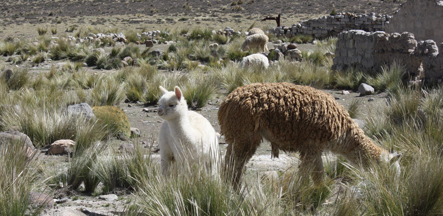 Alpacas are in the Camelid Family with camels being the largest. Llamas are their cousins and are larger than alpaca. Llamas and alpacas are both native to South America particularly Peru, Bolivia and Chile. The Altiplano region of Peru has alpaca herds roaming freely in the desert upper plateau region of the Andes Mountains. The alpaca shown in this picture are from the Altiplano.