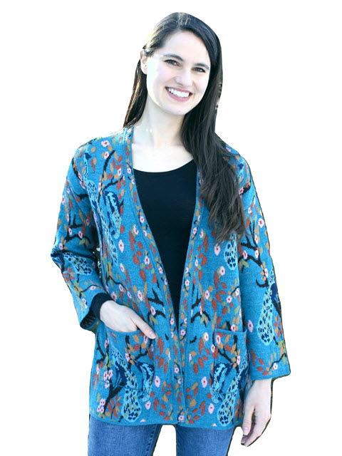 Aryn Alpaca Sweater – Our beautiful cardigan sweater intarsia knit in a floral design with peacocks has 2 patch pockets and is intarsia knit in 100% Alpaca. Designed by Mary Ann Weerts in a sophisticated casual open style cardigan. Hand wash cold water, mild soap, lay flat to dry or dry clean.