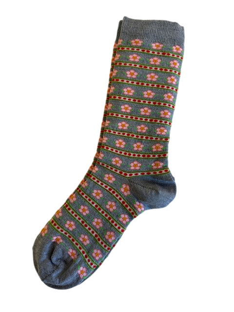 These are still soft, warm, and very comfortable yet lighter weight and not as thick in your shoe or boot. A floral design that is more fun and light hearted. 66% Baby Alpaca, 16% Bamboo, 16% Nylon and 2% Spandex.