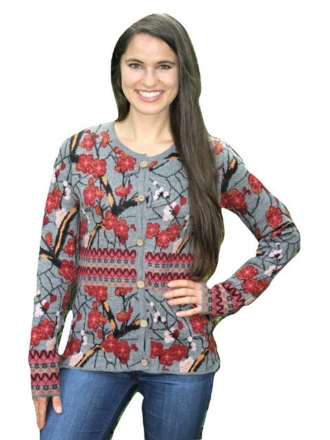 Cherry Blossom Alpaca Sweater – This alpaca sweater is machine knit in 100% Alpaca. Designed by Mary Ann Weerts in a floral design in shades of gray and red. It is a mix of patterns in a sophisticated design in a button style cardigan sweater. Intarsia Knit in 100% Alpaca. Hand wash cold water, mild soap, lay flat to dry or dry clean. Length of a size M is 24.5″