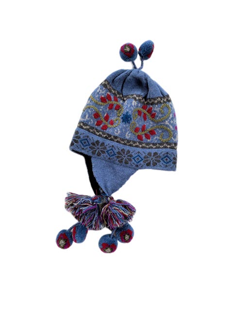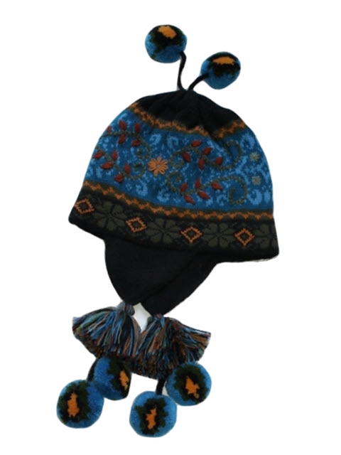 Nuestra Alpaca Ear Flap hat – Fleeced lined – Our classic alpaca ear flap hat has lots of details including hand embroidery, whip stitch around the hat and flap edges, pom poms on top and on the flaps. This beautiful ear flap hat coordinates with glittens in this section. Jacquard knit in 50% Alpaca and 50% Acrylic in a floral design. Hand wash cold water, mild soap, lay flat to dry. Fair Trade from Peru.