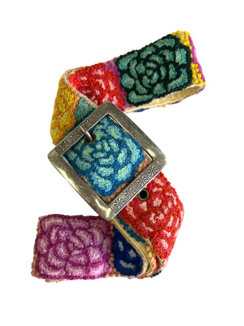 Rose Embroidered Belt – These are hand crewel embroidered floral belts in 100% Wool. The belts are 2″ wide with a cotton backing and metal buckle. Spot Clean. Fair Trade from Peru.